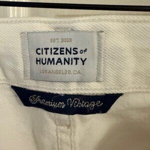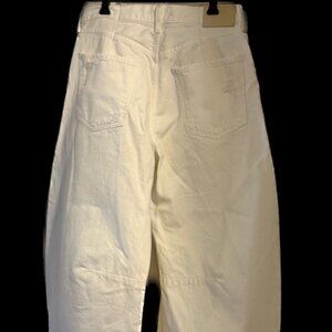 Worn a few times, Citizen of Humanity, Premium Vintage, Barrel Jeans, white, size 29/8, distressed marks on front and back pockets with frayed bottom hem gives lived in look to the overall piece, slouchy vibe, goes well with oversized or off shoulder tee/sweater or gauze type shawl/poncho great summer denim.