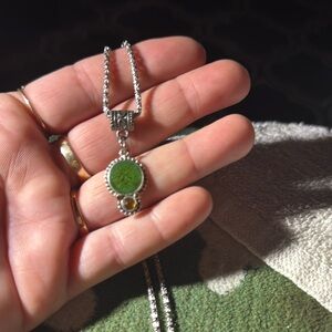 Elegant silver necklace featuring a green and gold pendant. Perfect for any occasion.