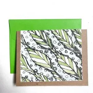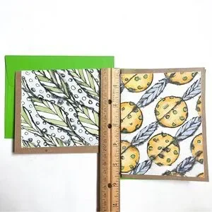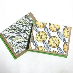 Set of artistic greeting cards with vibrant designs. Features green, yellow, and green patterns.