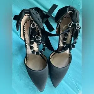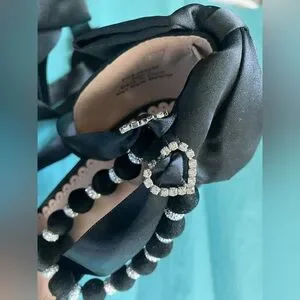 NWOT Chic Black Satin Bow Heels Velvet Beaded Rhinestone Heart Accents