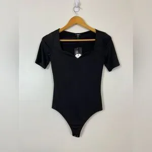 Elegant black bodysuit. Features a stylish neckline. Perfect for any occasion.