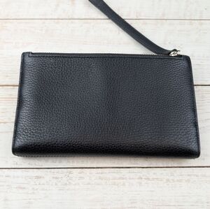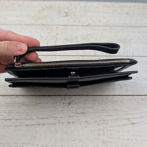 Elegant black leather wristlet with a sleek design. Perfect for any occasion.
