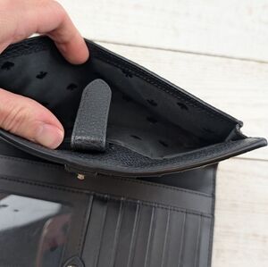 Interior lined with two way spade jacquard; 14 credit card slots; ID window; 4 slip pockets