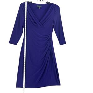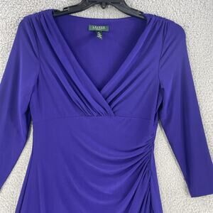 Lauren Ralph Lauren Dress Womens 8 Purple Ruched 3/4 Sleeve Stretch V Neck Elegant