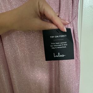 Pink sparkly Lulus dress. New with tags never worn. Floor light dress. Size Medium. Slit on the front left side