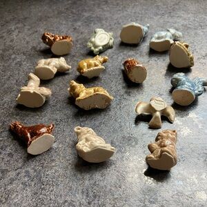 charming set of ceramic animal figurines. Featuring a variety of colors including brown, tan, and cream, these figurines add a touch of whimsy to any decor. They are Wade Whimsies red rose tea figurines. There is a small chip on the bottom of the turtle. Shown in the pictures