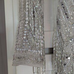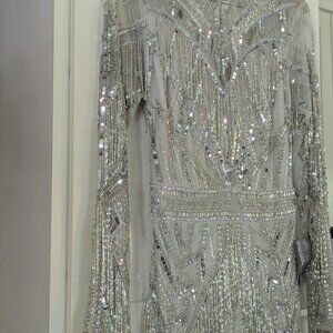 Shine bright in this stunning ASOS Edition silver sequin gown, designed exclusively for Nordstrom. Brand new with tags, this floor-length formal dress features sheer long sleeves and an elegant open back with a clasp closure at the neckline. Fully embellished with shimmering sequins, it’s perfect for weddings, galas, proms, or any special event where you want to make a statement. Size 12, with a flattering silhouette that skims beautifully. Don’t miss out on this gorgeous dress—ready to elevate your formalwear collection!