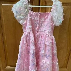 Elegant Rare Editions dress in pink. Features floral appliqués and delicate details. Ideal for special events. EUC