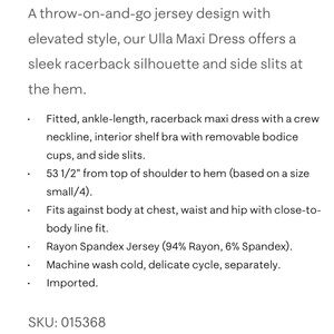 • Fitted, ankle-length, racerback maxi dress with a crew neckline, interior shelf bra with removable bodice cups, and side slits.