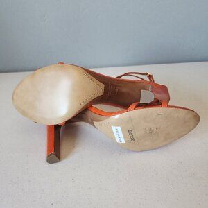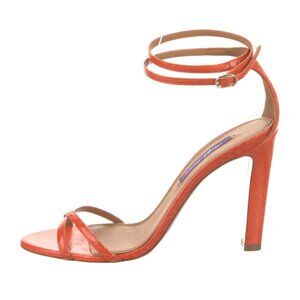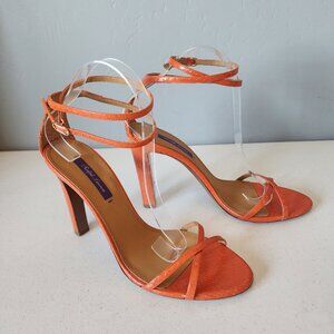 "NEW" Stunning Orange Snake Skin/Leather Ankle Wrap Sandals By Ralph Lauren Purple Label. Adjustable Ankle Strap, Almond Toe, Leather/Upper, Lining, Cushioned Foot Bed & Soles, Leather/Snakeskin Wrapped 4.1/4" Heel, New, Never Worn, Box, Only Tried On:) Rt.795.00 approx. Size 41 B/ Chart 11, Foot Bed Measures 10.5" for Reference. NOTE: Runs Small Posting Size 10. * Perfect Wedding Guest/Event/Spring-Summer Sandal.