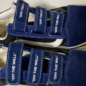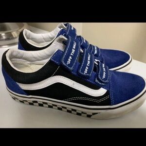 One of a kind classic appeal styled vans come with three hook-and-loop strap fasteners with "Off the Wall" graphics. No stains and clean bottoms. Stylish and comfortable Vans sneakers for kids. Featuring a vibrant blue and black design, these shoes are perfect for everyday wear. The durable construction ensures long-lasting use.