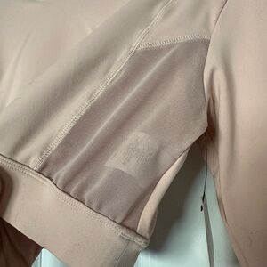 Stay stylish and comfortable with this blush pink cropped athletic hoodie. Perfect for casual outings or workouts, this top adds a touch of elegance to your wardrobe. This has mesh vents on each side, measures 13” in length, and has convenient thumb holes. 88% nylon, 12% spandex, never worn, new with tags!