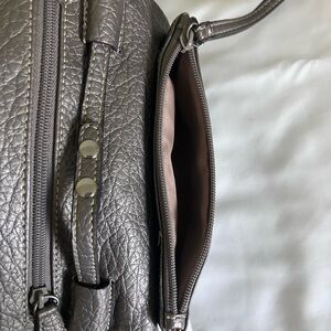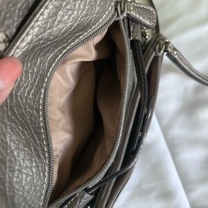 Nine West silver crossbody bag. Can be converted to a clutch or wristlet. Long strap is removable. 1 large zipper compartment and 3 small ones. Very good condition. Size 5” x 9”