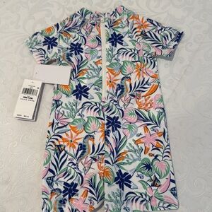 NWT This is a beautiful Ralph Lauren tropical print shortall rash guard swim suit. White background, with Back zipper, short sleeves, crew neck. Made of 100% nylon. UV protection. Fits 9-12 months.
