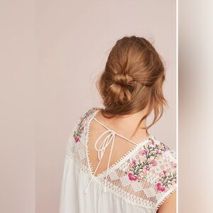 A beautifully feminine, gauzy, white, semi-sheer blouse featuring floral embroidery and lace accents at the top—a signature boho-chic piece from Anthropologie’s Ranna Gill collection. Made from a blend of rayon and nylon, this lightweight top is soft, breathable, and perfect for layering through the seasons.