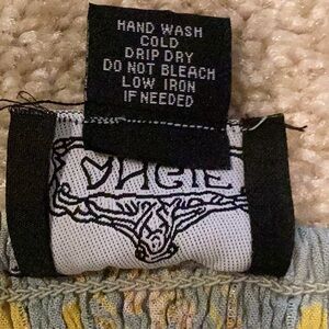 Angie fun summer dress in a size large. I feel it fits more like a medium. But is flowy with stretch in the middle so probably fits a lot of body types. Has a bit of shimmer throughout which is fun. The ties at the shoulders are for look only. Not adjustable