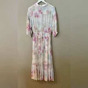 Very soft and comfortable 100% Viscose watercolor dress with button-down front. Details such as a ruched waist and elastic on the bottom of the sleeves make for a great fit.