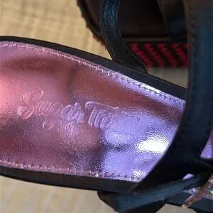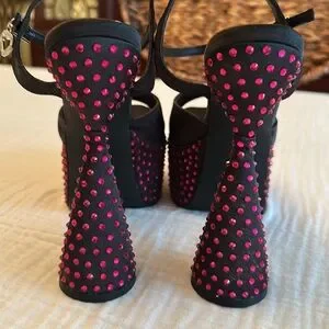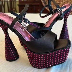 These black satin platform heels have hot pink sparkly rhinestones all over, adjustable buckled ankle straps with heart charms, square toes, and flared heels. Get your disco on!