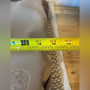 Excellent condition! This all leather bag is a tan color, size is approximately 13 X 13 X 5 but measurements are in photos. Inside is clean, features a key holder and smells like heavenly leather 😊 very chic and stylish. Leather is soft and pebbled. Twilly included! Please ask questions before purchasing