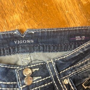 Discover the stylish appeal of Vigoss's jean capris, designed with a medium-dark wash and subtle fading for a trendy, worn-in look. The rolled cuffs add a casual touch, perfect for everyday wear. Enjoy the unique decorative stitching and bling that enhances the overall character of these jeans.