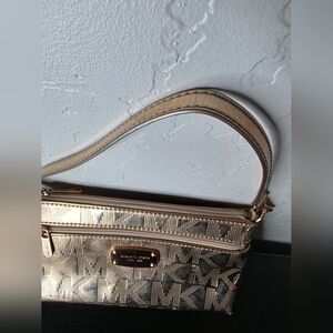 The Michael Kors Gold Clutch Wristlet is a stunning accessory crafted for elegance and sophistication. Its shimmering gold finish and sleek design make it an ideal choice for evening wear or special occasions. Featuring a textured pattern and a signature Michael Kors logo, this clutch is both stylish and functional. The wristlet style ensures convenience and ease of carrying, making it a perfect addition to any dressy ensemble.