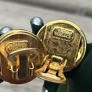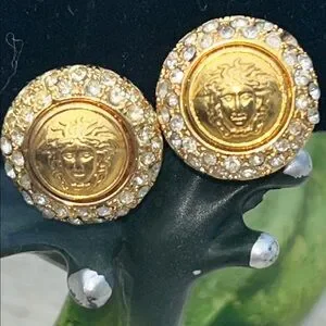 Versace Vintage clip on earrings showcase a luxurious gold Medusa design, embodying the brand's iconic style. The intricate baroque detailing and crystal accents add a touch of opulence, making them a standout piece in any jewelry collection. Perfect for those who appreciate classical elegance with a modern twist, these earrings are a testament to Versace's commitment to high-quality craftsmanship.