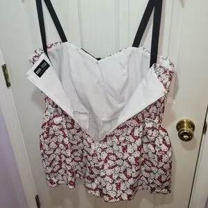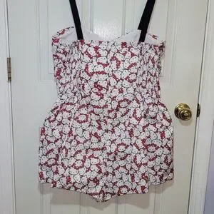 Women's size 2X/18 romper by Unique Vintage in an all over Hello Kitty print. Black bow on front, matching black straps with two button holes for adjustability. Back panel is smocked and stretchy. Exterior is 60% polyester, 35% cotton, 5% spandex. Lining is 97% polyester, 3% spandex. Hand wash cold, lay flat to dry.