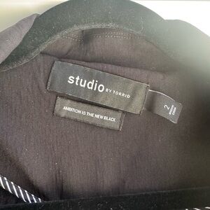 The Torrid black blazer offers a relaxed fit with 3/4 length sleeves, making it a versatile addition to your wardrobe. Crafted from a soft material, it provides comfort and style for business casual settings. The jacket's sleek design is perfect for adding a touch of sophistication to any outfit.