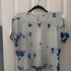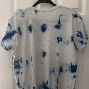 Embrace a casual yet chic look with this Lululemon Athletica crop tee, showcasing a striking blue and white color palette. The short sleeves and artistic tie-dye design make it a perfect choice for relaxed outings. Its unique pattern adds a touch of creativity to your everyday style.