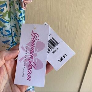 Charming casual dress by Bonnie Jean. Features a pink and blue floral pattern. Sleeveless design with a flowing skirt. Lined. Measurements in final photos to decide.