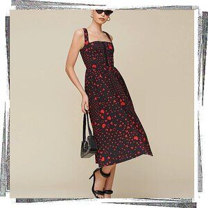 New with tags. This Avec Les Filles fit-and-flare midi dress features a square neck, decorative corset detailing, back zipper closure, a stretch cotton fabrication, fully-lined interior, and chic black and red heart print. Bestseller!!