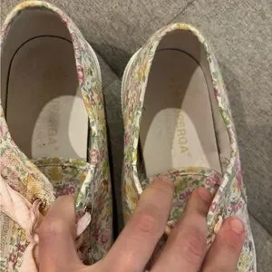 Size 40 EUC Superga collab with LoveShackFancy. These shoes are adorable, unfortunately a tad too small for me. They are in EUC and made very well for a canvas sneaker with a thick sole. Ribbon laces.