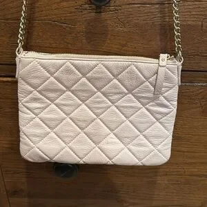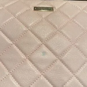 This is a light pink quilted leather Kate spade purse. It has a part metal part leather strap. There is one mark on the front of the bag (see photo) but otherwise the outside of the bag is in good shape. The inside also has some staining (see photos to know exactly where) but otherwise it’s in good shape but please make sure you do note that there is some staining. The bag measures 10” x 8”. Feel free to make me an offer.