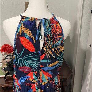 This stunning sundress features a vibrant mix of blue and pink hues, perfect for a night out or resort wear. The one-shoulder design and sleeveless cut offer a chic and modern look, while the thigh-high slit adds a touch of drama. Crafted from lightweight fabric, it drapes elegantly, making it ideal for warm weather occasions. Receive many compliments, wore it three times. Perfect summertime dress.