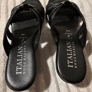 These are a pair of women's Black Italian Shoemakers Wedge dress sandals. Worn once, my wife says she can't wear anything with a heel anymore. They are in perfect condition. If purchased early enough they would ship the same day.