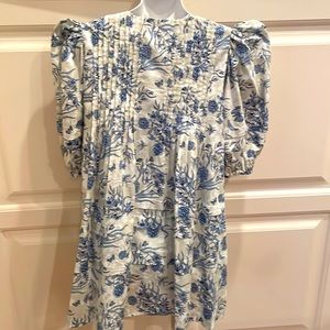 Elegant floral dress with puff sleeves. Features a blue and white pattern. Perfect for any occasion.