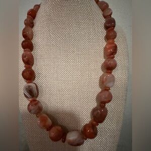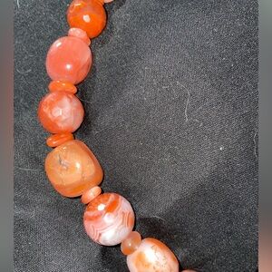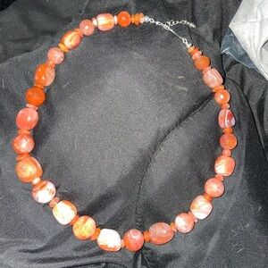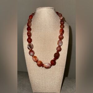 Necklace has multi shaped beads of red picante agate strung together