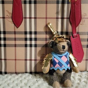 Charming Burberry Thomas bear keychain in a knight outfit. Features blue and pink armor with gold accents. Perfect accessory for bags.