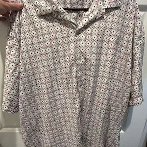 Casual button-down shirt with a geometric design. Features red and blue accents on a white background. Perfect for everyday wear.