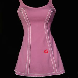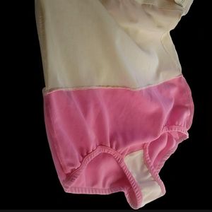This Vintage one piece swim dress in pink and white features a classic scoop neckline and medium-width straps. The fitted design with princess seams offers a flattering silhouette, while the mid-thigh length provides modest coverage. Perfect for those seeking a stylish and timeless swimwear option.