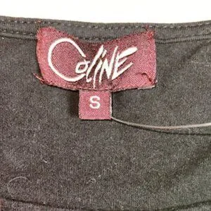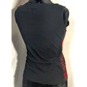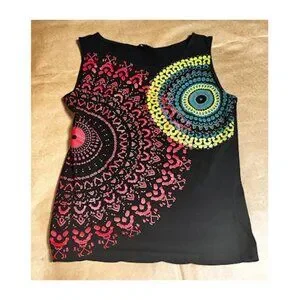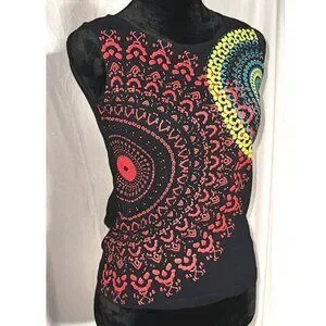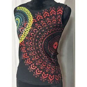 Coline black sleeveless top with a red and yellow kaleidoscope design on the front. The back is plain black. The top measures 12 inches across the shoulders and is 21 inches long.
