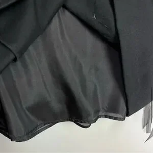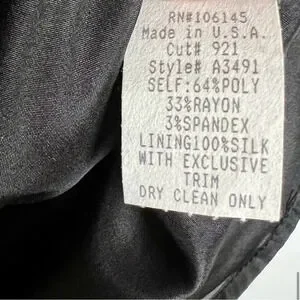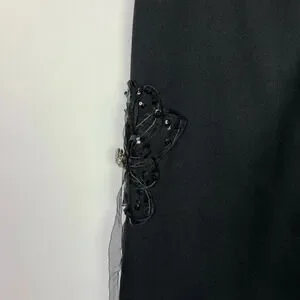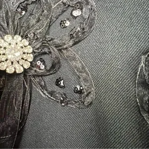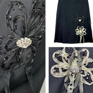 Sheer organza ribbon flowers in black and cream. Rhinestone buttons adorn the centers of the flowers and sequins are sprinkled throughout. Has a slight A line shape. Year round wear made of poly, rayon, spandex blend gives it a bit of stretch. Lining is 100% silk. Excellent condition. No flaws.