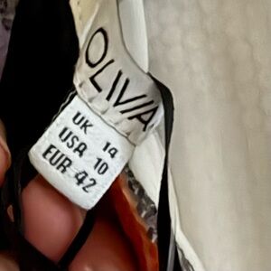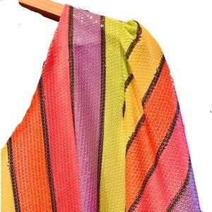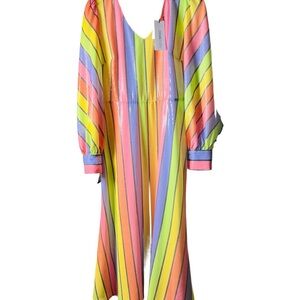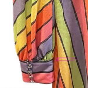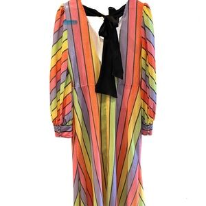 Olivia Rubin Rainbow Sherbet striped sequin dress size 10. Zip back closure and crystal buttons on the cuffs. Low v-neck front and low back, it includes a black fabric tie in the back to keep the back snug. Sequins are made with sustainable materials. Cute dress for so many occasions, from garden party to wedding guest, to special dinner out. Pair it with a colorful pair of shoes or a plain black heel to bring out the black stripe. This is not a dress for someone who wants to blend into the scenery! In this dress, you WILL be noticed.