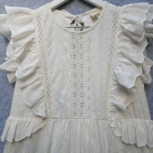 This gorgeous sleeveless A-line mini dress by Sézane features 3 patterns of all over floral embroidery, ladder stitching framing the front & back bodice, 2 layers of gathered ruffles around the armholes, a peplum-like flounce above each hip, and an open back with a pretty tie at the neck