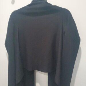 This is a wonderful and versatile new without tags Jarbo piece in a black. The fabric has a lovely feel and look in a really nice stretch combo of rayon, nylon and spandex in size 38 S/M. There are long sleeves, and an open front. There is a shawl collar with long front pieces that can just hang down, thrown over one shoulder or tie in front. The back is shorter. Please look up the Jarbo website to see the quality of the Jarbo collections. This is a great travel piece and looks great with a tee shirt and jeans all the way up to a special evening out over any style dress. It is a true black color. Sometimes the pictures on black garments tend to have a hint of purple but that's only the lighting giving off that cast.