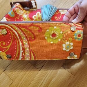 Discover the elegance of the Spartina 449 shoulder bag and matching wallet, featuring a striking red and brown multi color palette with intricate floral and scroll patterns. The bag does not have a shoulder strap, giving prospective buyers the opportunity to customize it.