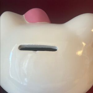 Charming Hello Kitty figurine, bank,Features pink dress with hounds tooth black and white too. Carrying purse, shopping bags. In used condition. Pics show chips, please look closely. She’s still super cute! And she still has her stopper!