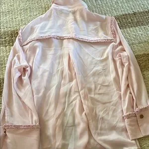Elegant pink blouse. Features ruffle trim. Button-up front. Long sleeves with buttoned cuffs. Gold button details, easy breezy timeless chic. Pretty in pink dress up or down. Size L