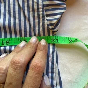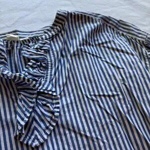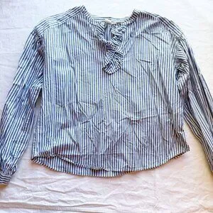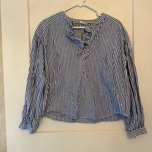 Lightweight cotton blouse with a classic striped design and stylish ruffle details at the neckline. Long sleeves provide versatile wear. Armpit to armpit measures 21 inches. Top of shoulder to bottom measures about 23.5 inches. Gap women's size small. Smoke free home.