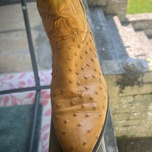 Elegant cowboy boots crafted from premium ostrich leather. Features a warm tan hue with detailed craftsmanship. Boots are used but have plenty of life left. Will need new insoles